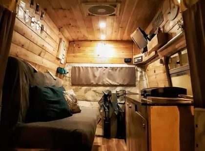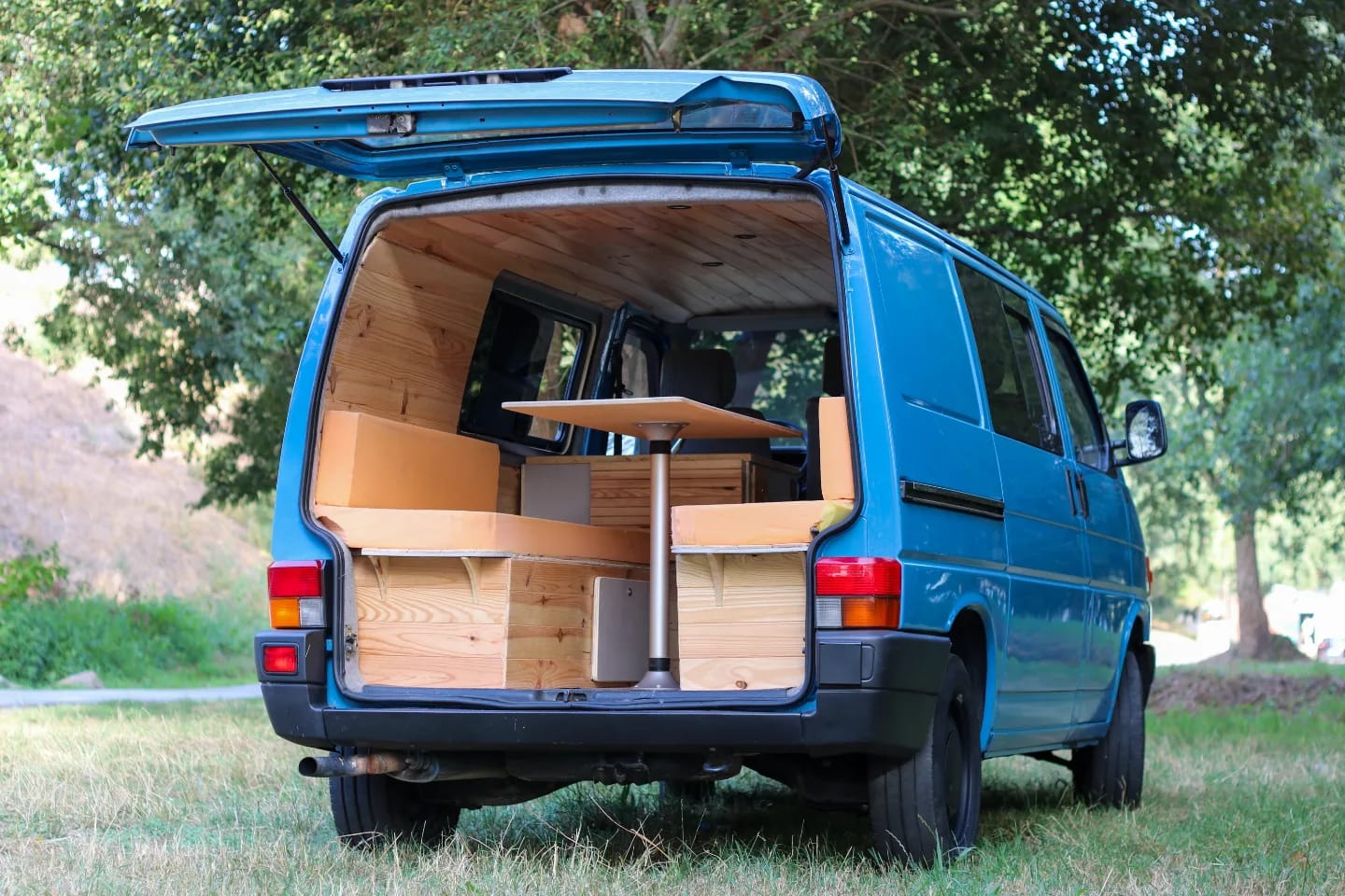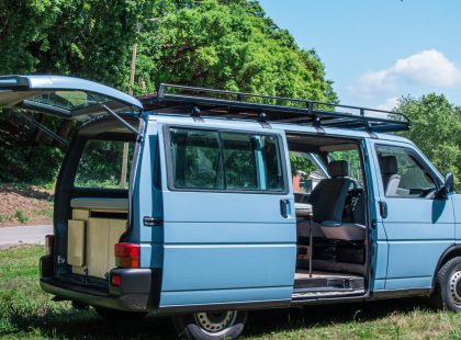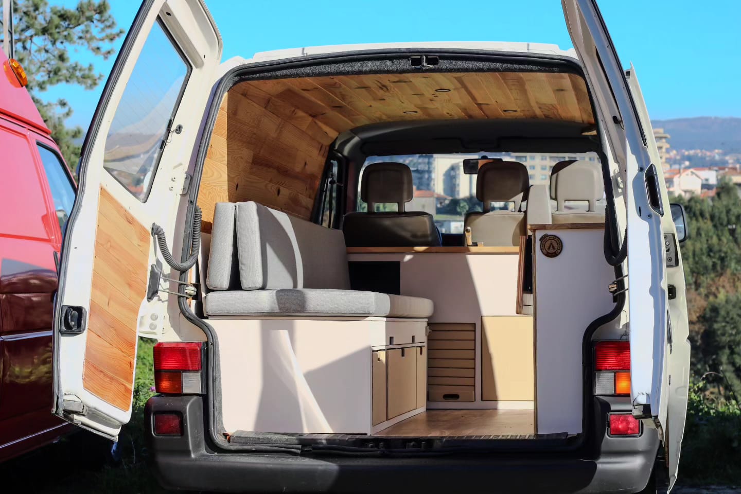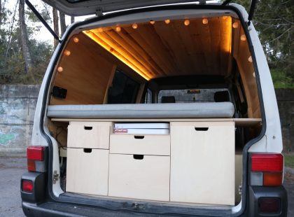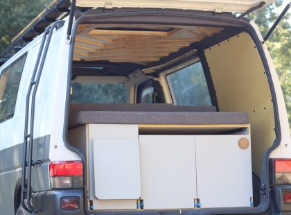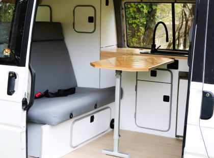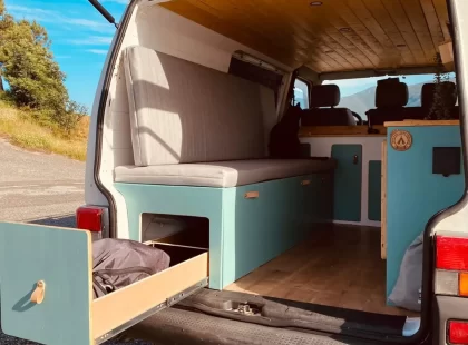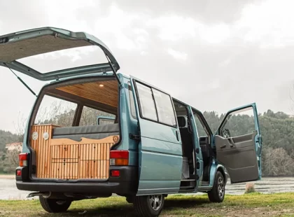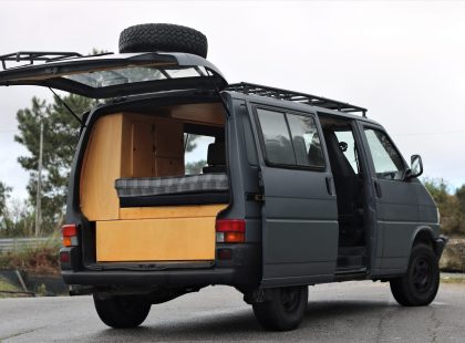 Uma Volkswagen T4 2.5 TDI, equipada com bateria secundária, painel solar, fichas USB, frigorífico Compressor, fogão de campismo esta campervan vai ao encontro do menos é mais, ainda assim não perdendo a total autonomia elétrica e os traços de carpintaria artesanal.