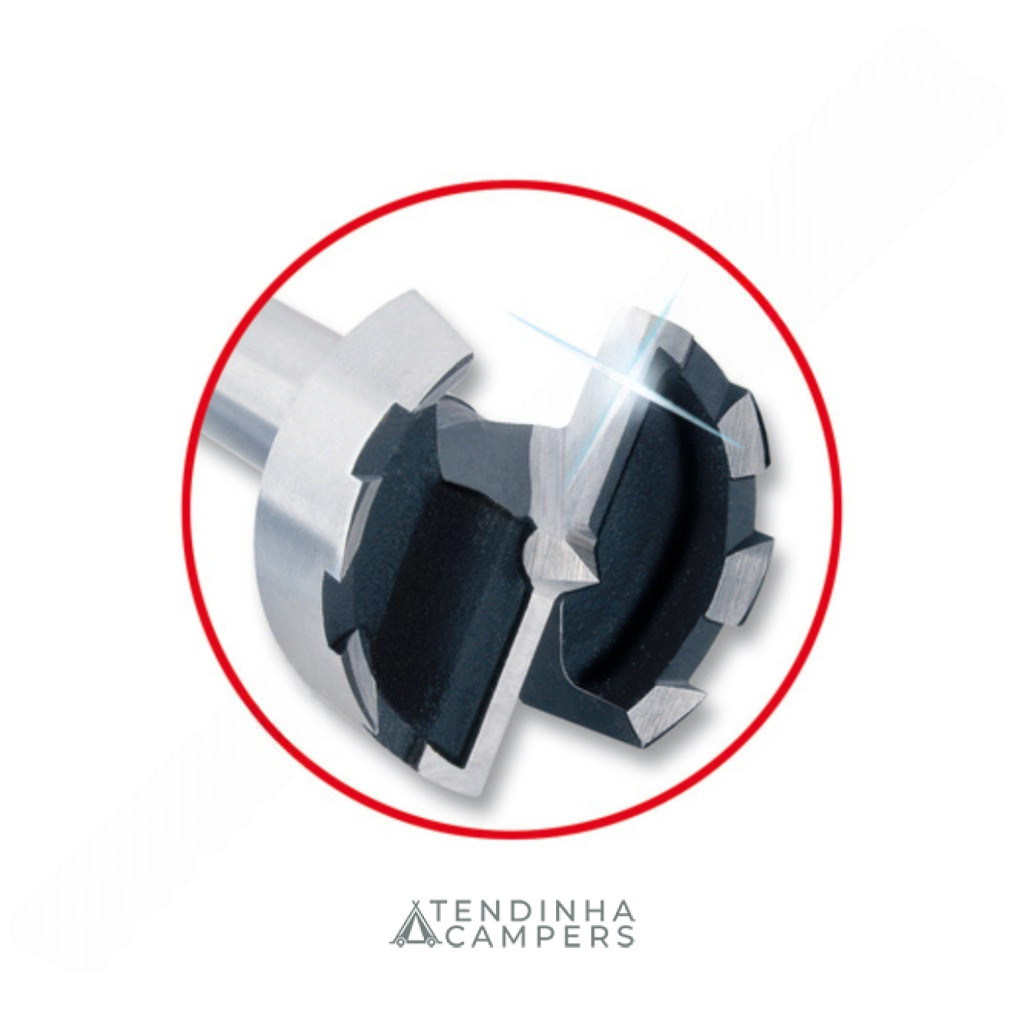 Gumes periféricos dentados: Permitem um corte limpo das fibras da madeira nas extremidades do furo.