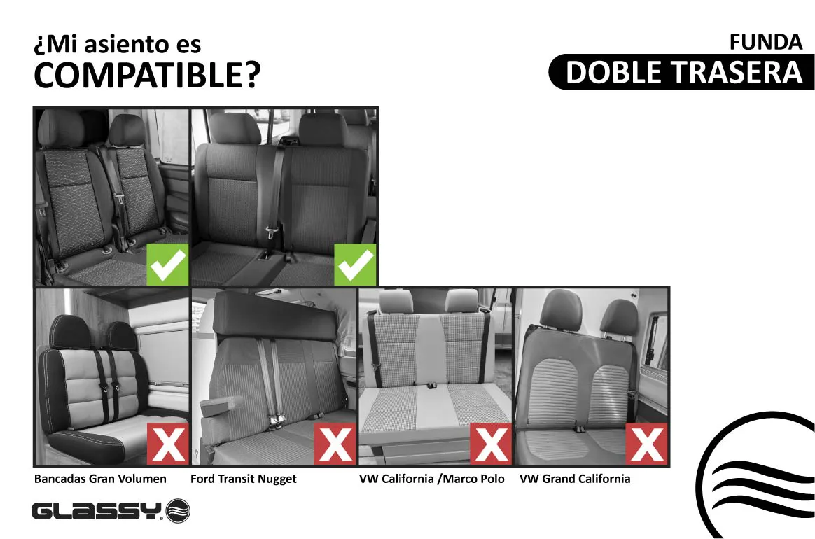 Esta versão de capa dupla para assentos traseiros de passageiros é adequada para a maioria das vans e campers, incluindo: