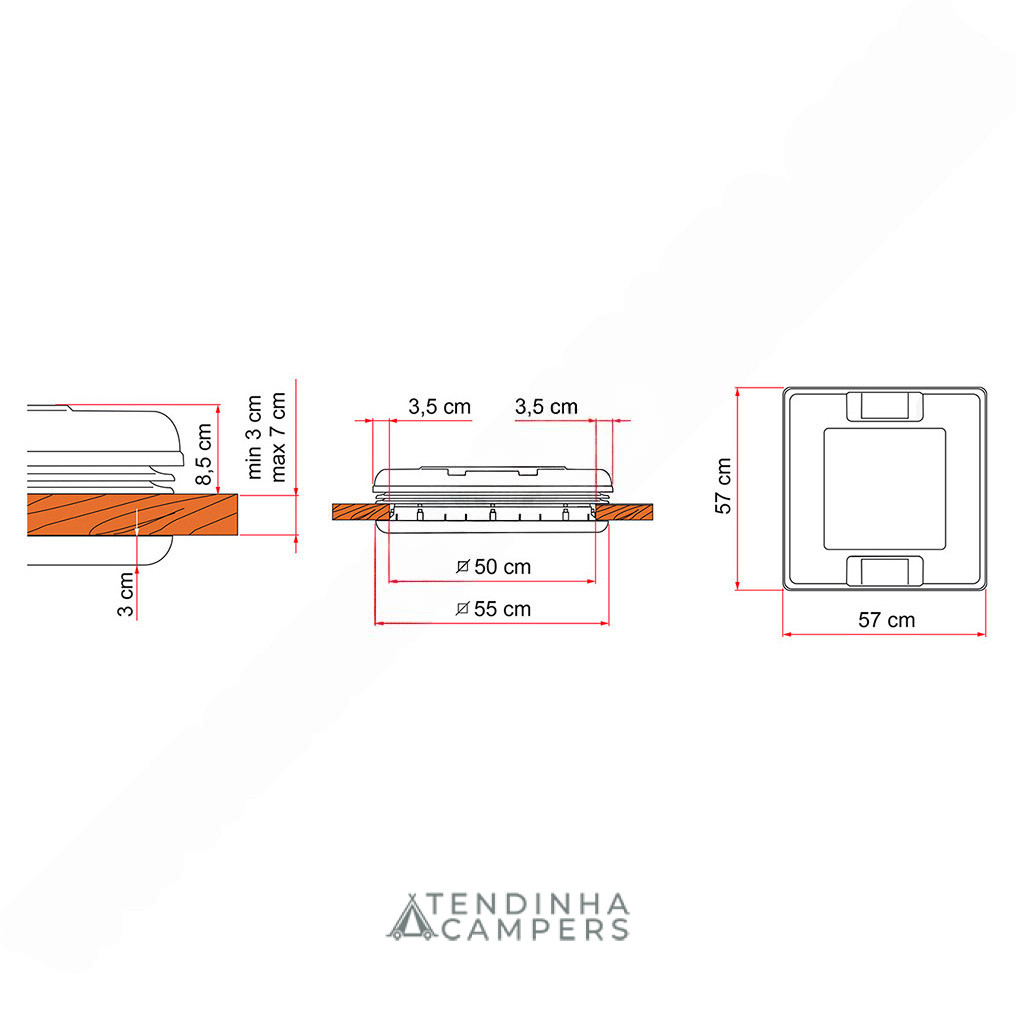 Vedação: Recomenda-se vivamente o uso de fita de butilo na base de contacto com o tejadilho para garantir a estanqueidade.
