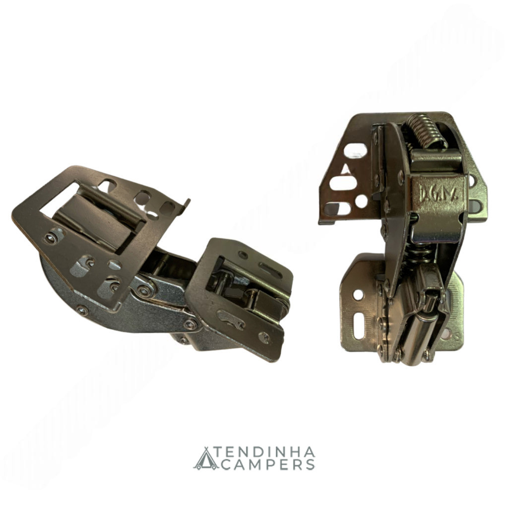 Dobradiça com mola e travão, ideal para armários superiores de autocaravanas e furgonetas camper.