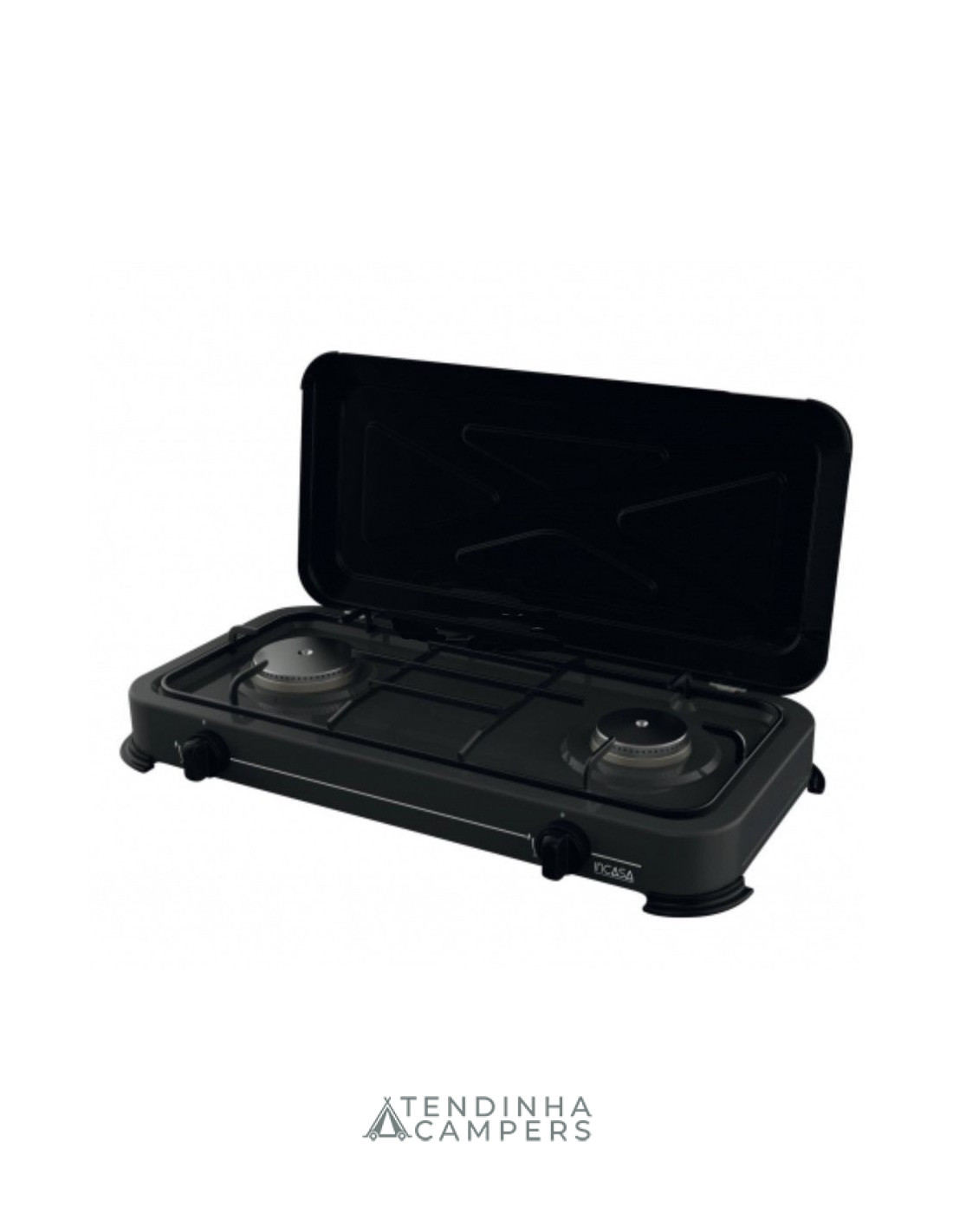 Fogão de 2 bicos para utilização em mesa ou bancada, compatível com garrafas de gás butano ou propano (pressão regulada a 30 mbar). Inclui ligação para mangueira de gás laranja (mangueira e regulador não incluídos).