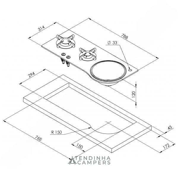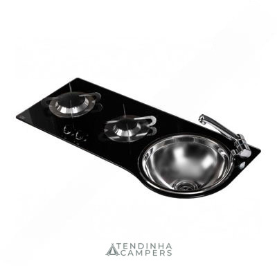 Cozinha de 2 queimadores fabricada em vidro temperado antirriscos, com queimador inoxidável.