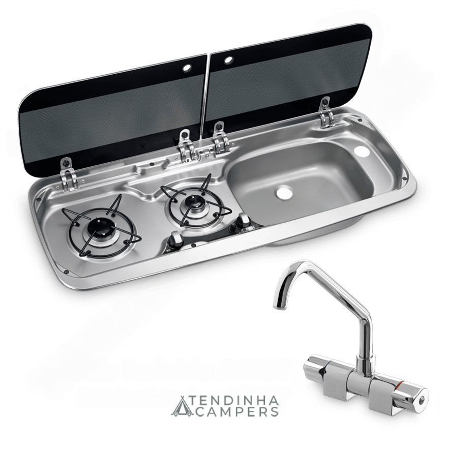 Combinação cozinha de 2 queimadores/lava-loiça com tampas de vidro e torneira AC537 incluída.
