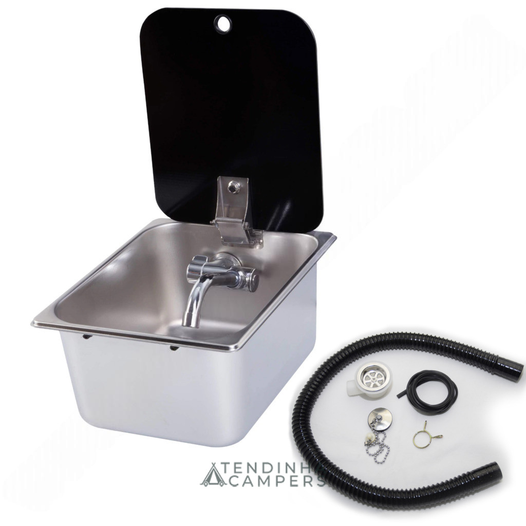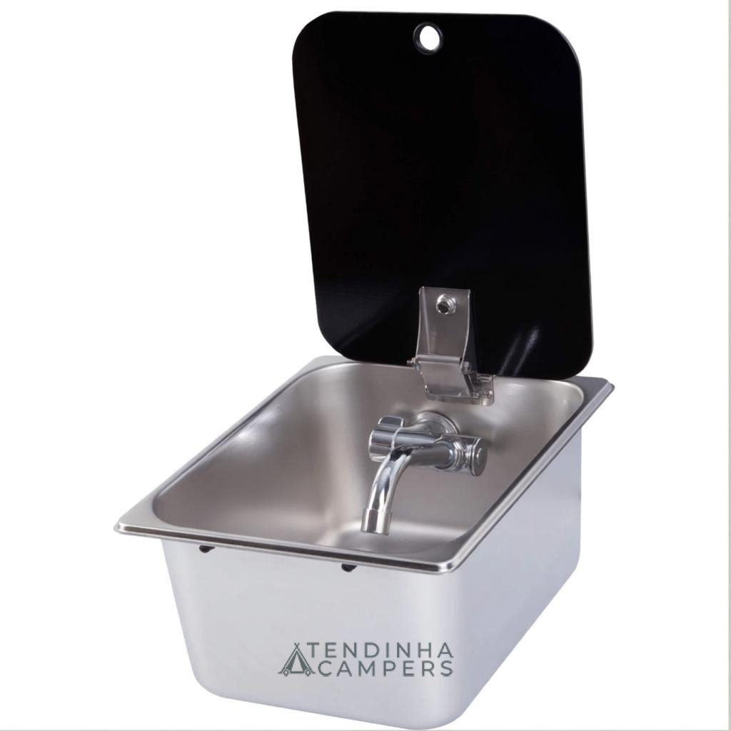 Lava-loiça quadrado inoxidável com tampa de vidro temperado integrada.