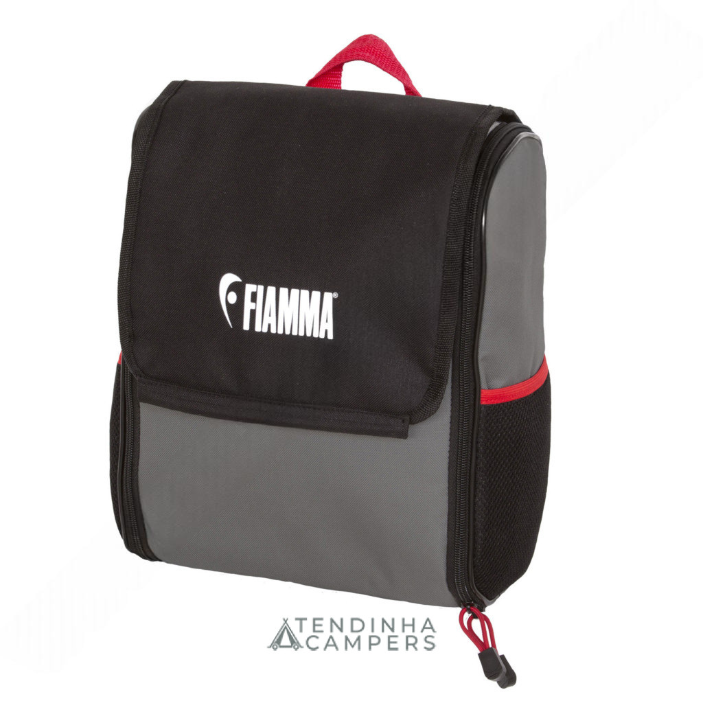 Útil organizador, pensado para guardar os utensílios de banho, graças a numerosos e largos bolsos. Pode ser pendurado nas portas das autocaravanas. Fechado, pode ser transportado com a sua cómoda pega. Fabricado em poliéster resinado, resistente e impermeável.